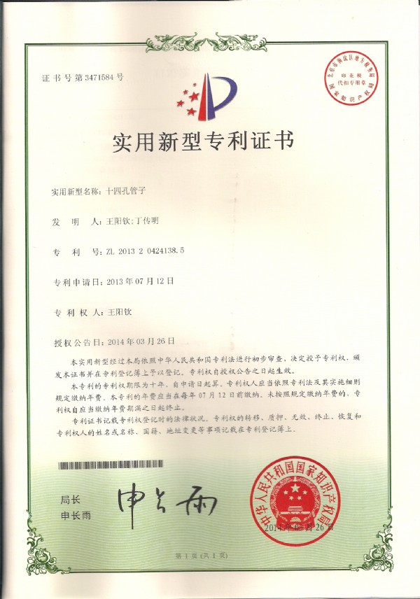 实用新型专利“十四孔管子”于2014年3月喜获国家知识产权局批复。